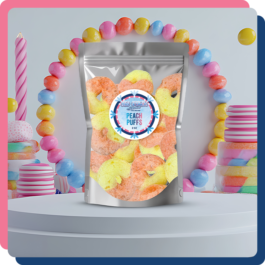 Peach Puffs capture the juicy sweetness of ripe peaches in a light and airy crunch. Every bite melts in your mouth, giving you a perfect mix of fruity flavor and playful texture. They’re the kind of treat that makes snacking feel fun, refreshing, and oh-so satisfying.